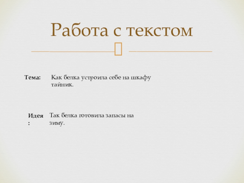 Работа с текстомТема:Как белка устроила себе на шкафу тайник.Идея:Так белка готовила запасы на зиму.