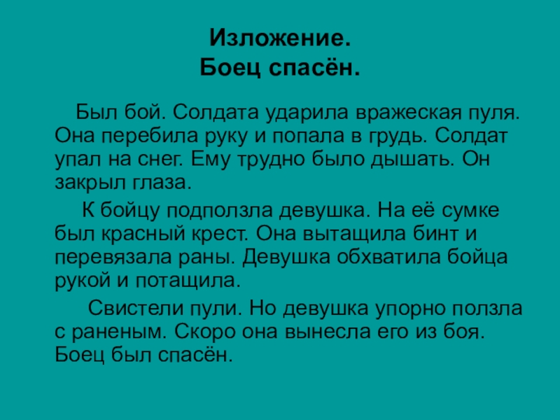 Изложение. Боец спасён. Был бой. Солдата ударила вражеская пуля. Она перебила руку и попала в грудь. Солдат упал на снег. Ему трудно было дышать. Он закрыл глаза. К бойцу подползла