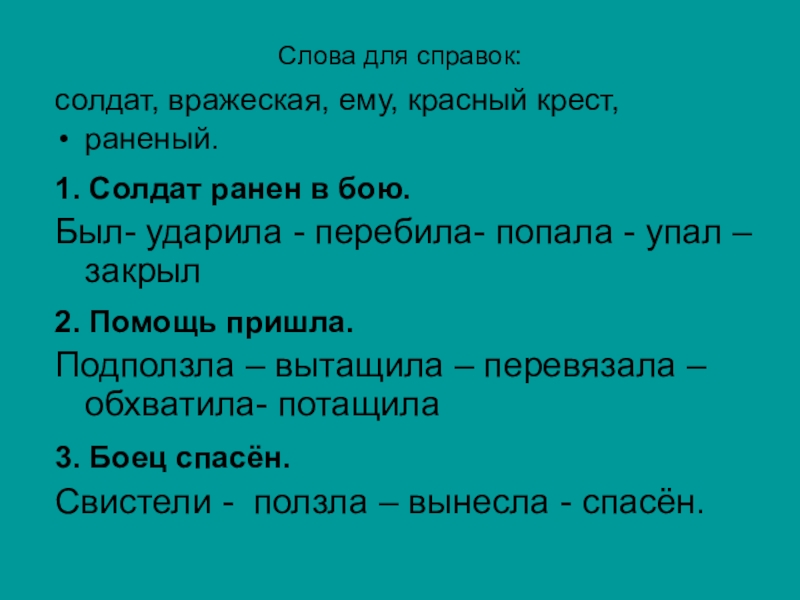 Слова для справок:солдат, вражеская, ему, красный крест,раненый.1. Солдат ранен в бою.Был- ударила - перебила- попала - упал