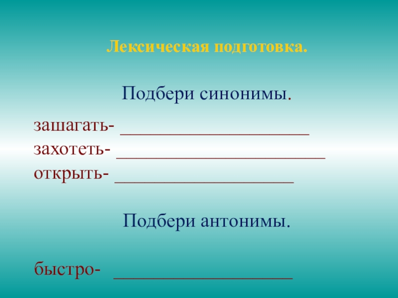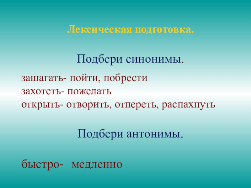 Лексическая подготовка.Подбери синонимы.зашагать- пойти, побрестизахотеть- пожелатьоткрыть- отворить, отпереть, распахнутьПодбери антонимы.быстро- 	медленно