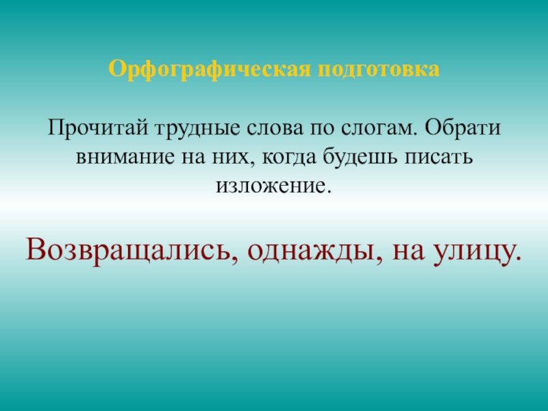 Орфографическая подготовка Прочитай трудные слова по слогам. Обрати внимание на них, когда будешь писать изложение.Возвращались, однажды, на