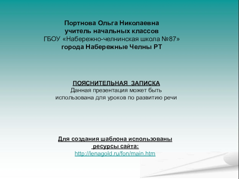 Портнова Ольга Николаевнаучитель начальных классовГБОУ «Набережно-челнинская школа №87»города Набережные Челны РТПОЯСНИТЕЛЬНАЯ ЗАПИСКАДанная презентация может быть использована для