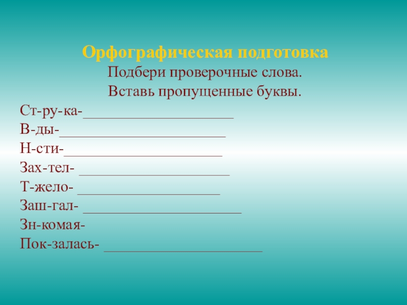 Орфографическая подготовкаПодбери проверочные слова. Вставь пропущенные буквы.Ст-ру-ка-___________________В-ды-_____________________Н-сти-____________________Зах-тел- ___________________Т-жело- __________________Заш-гал- ____________________Зн-комая-Пок-залась- ____________________