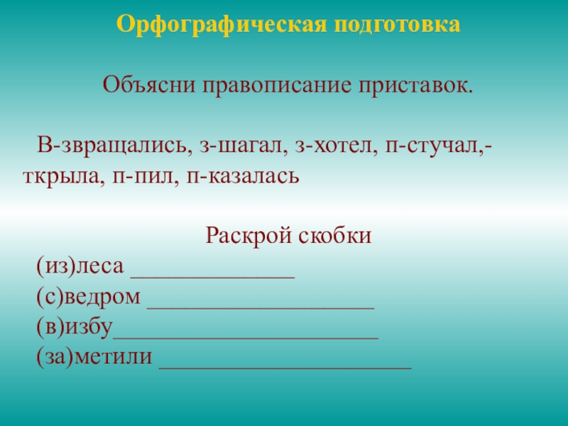 Орфографическая подготовкаОбъясни правописание приставок.В-звращались, з-шагал, з-хотел, п-стучал,-ткрыла, п-пил, п-казаласьРаскрой скобки(из)леса _____________(с)ведром __________________(в)избу_____________________(за)метили ____________________