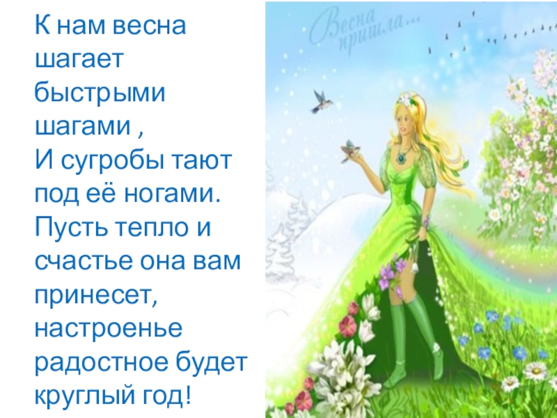 К нам весна шагает быстрыми шагами , И сугробы тают под её ногами. Пусть тепло и счастье