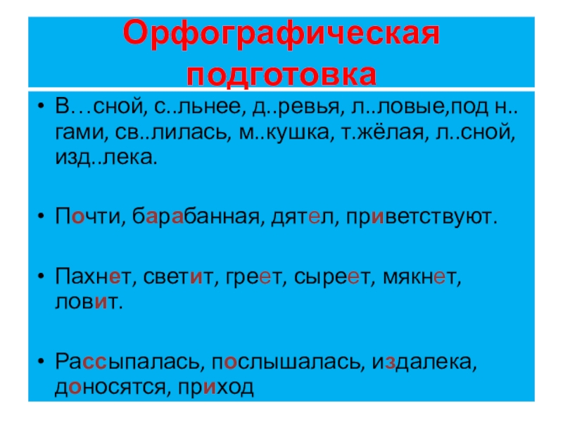 Орфографическая подготовкаВ…сной, с..льнее, д..ревья, л..ловые,под н..гами, св..лилась, м..кушка, т.жёлая, л..сной, изд..лека.Почти, барабанная, дятел, приветствуют.Пахнет, светит, греет, сыреет,