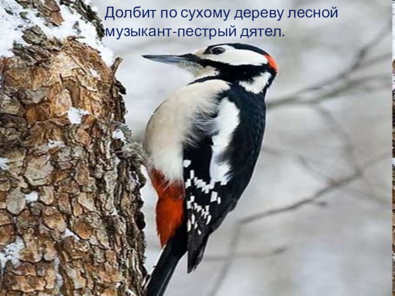 Долбит по сухому дереву лесной музыкант-пестрый дятел.