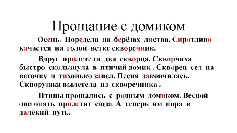 ПланI.Одинокий скворечник. (осень, поредела, сиротливо,на голой ветке)II.Прощальная песенка. (вдруг, скворчиха, скользнула, тихонько)III.В далёкий путь. (прощались, домиком, прилетят,