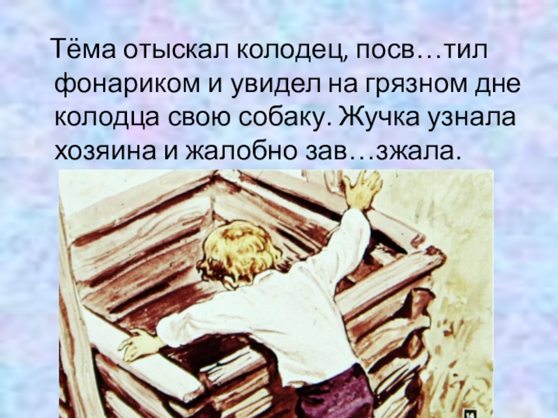 него ничего не получилось. Тогда мал…чик набрался храбрости, обвязал себя верё…кой и полез в колодец. Его обдало смрадом и хол…дом. Стены колодца были скользкими. Тёме было очень страшно. Но он добрался до грязного, высохшего дна колодца, схватил Жучку и полез обратно.