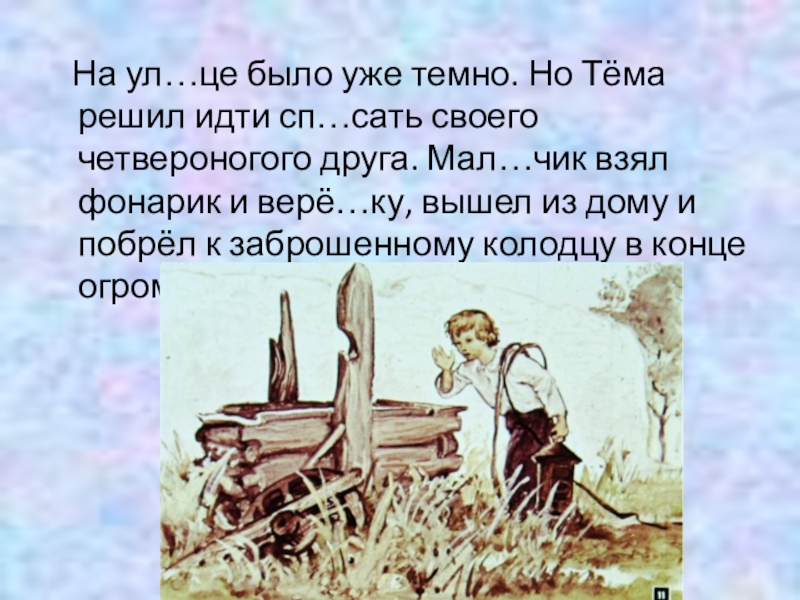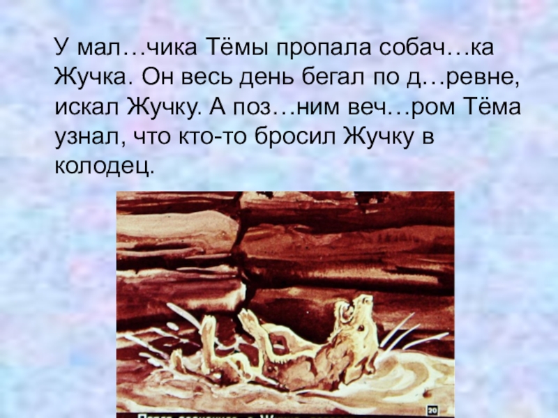 У мал…чика Тёмы пропала собач…ка Жучка. Он весь день бегал по д…ревне, искал Жучку. А поз…ним веч…ром Тёма узнал, что кто-то бросил Жучку в колодец.