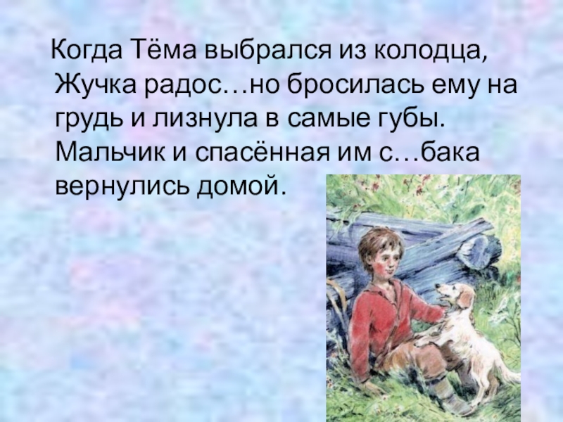 Когда Тёма выбрался из колодца, Жучка радос…но бросилась ему на грудь и лизнула в самые