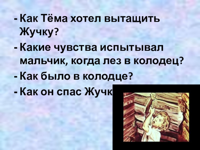 Как Тёма хотел вытащить Жучку?Какие чувства испытывал мальчик, когда лез в колодец?Как было в колодце?Как он спас