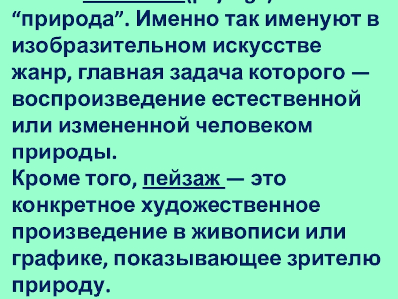 рисунок, картина, изображающая природу, вид, а также описание природы в литературном произведении.
