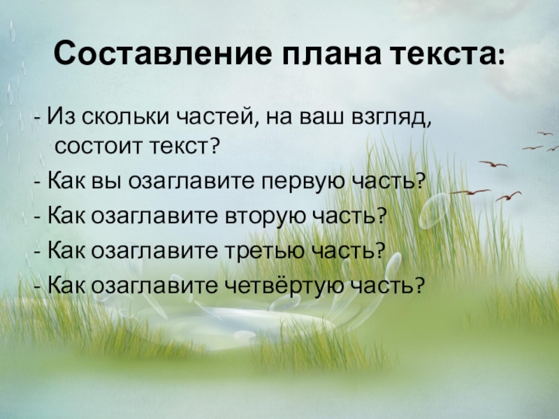 Составление плана текста:- Из скольки частей, на ваш взгляд, состоит текст? - Как вы озаглавите первую часть?