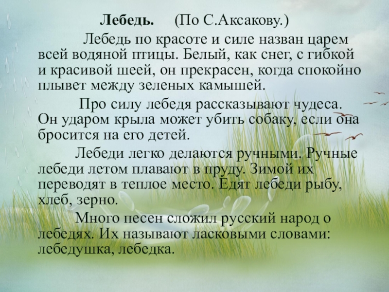 Лебедь.   (По С.Аксакову.)        Лебедь по красоте и силе