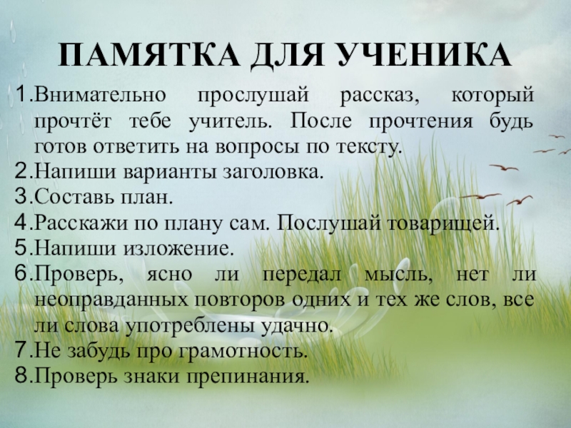 ПАМЯТКА ДЛЯ УЧЕНИКАВнимательно прослушай рассказ, который прочтёт тебе учитель. После прочтения будь готов ответить на вопросы по