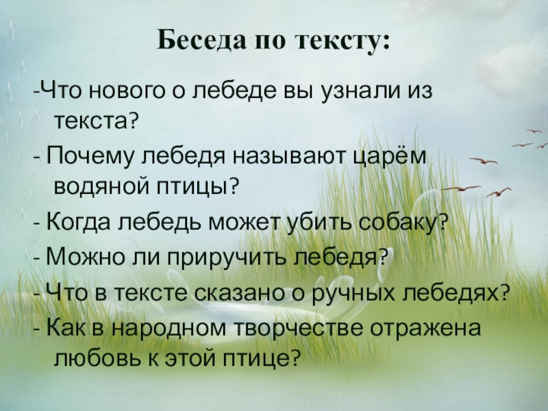 Беседа по тексту:-Что нового о лебеде вы узнали из текста?- Почему лебедя называют царём водяной птицы? -