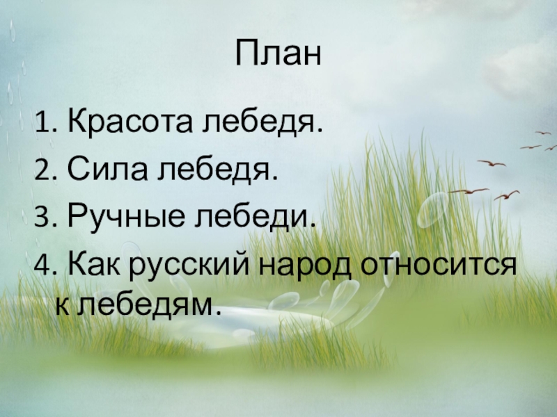План1. Красота лебедя.2. Сила лебедя.3. Ручные лебеди.4. Как русский народ относится к лебедям.