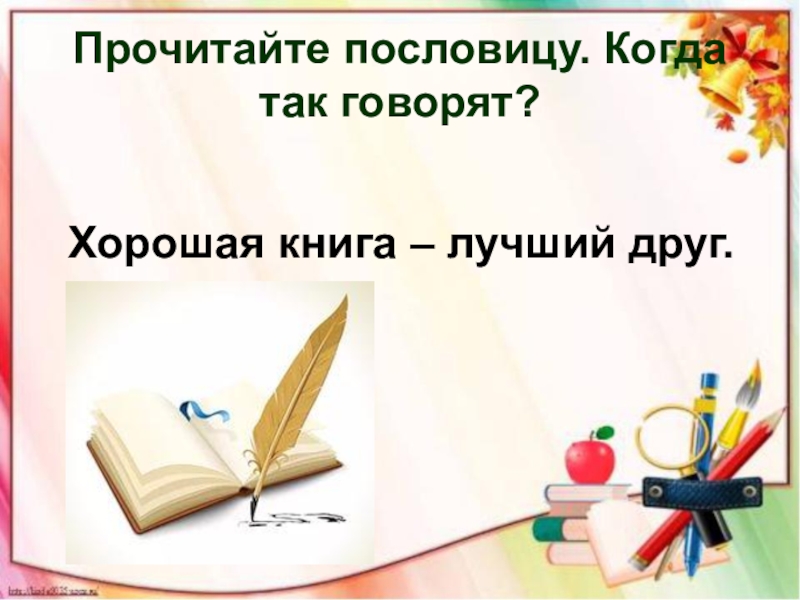 Прочитайте пословицу. Когда так говорят?Хорошая книга – лучший друг.