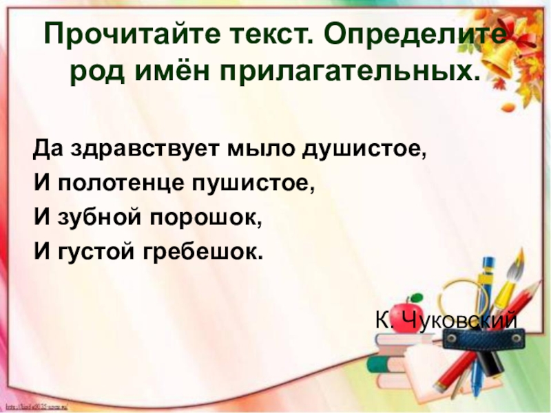 Прочитайте текст. Определите род имён прилагательных.Да здравствует мыло душистое,И полотенце пушистое,И зубной порошок,И густой гребешок.К. Чуковский