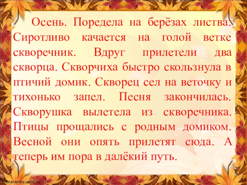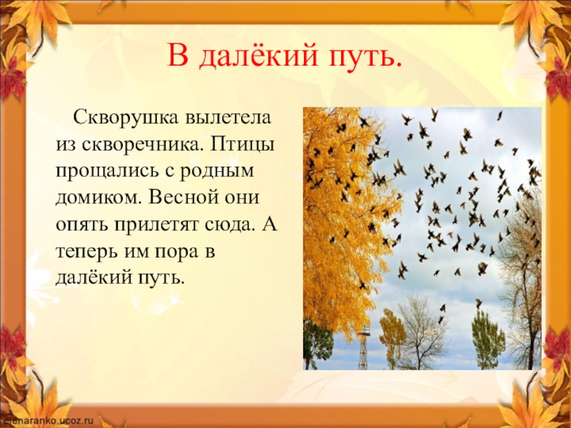 ветке скворечник. Вдруг прилетели два скворца. Скворчиха быстро скользнула в птичий домик. Скворец сел на веточку и тихонько запел. Песня закончилась. Скворушка вылетела из скворечника. Птицы прощались с родным домиком. Весной они опять прилетят сюда. А теперь им пора в далёкий путь.