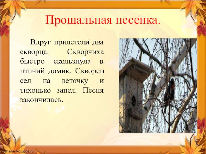 Прощальная песенка.   Вдруг прилетели два скворца. Скворчиха быстро скользнула в птичий домик. Скворец сел на