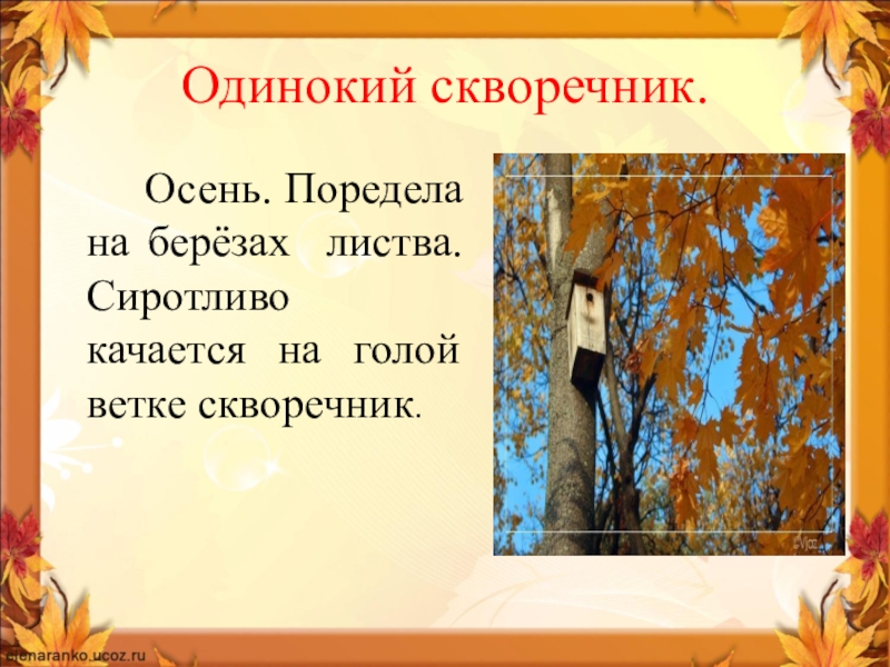 Одинокий скворечник.    Осень. Поредела на берёзах листва. Сиротливо качается на голой ветке скворечник.