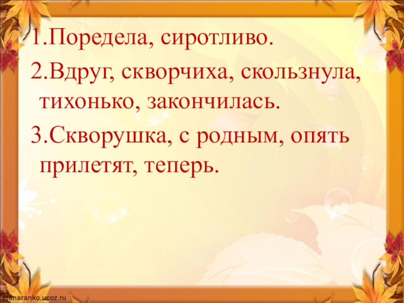 1.Поредела, сиротливо. 2.Вдруг, скворчиха, скользнула, тихонько, закончилась. 3.Скворушка, с родным, опять прилетят, теперь.