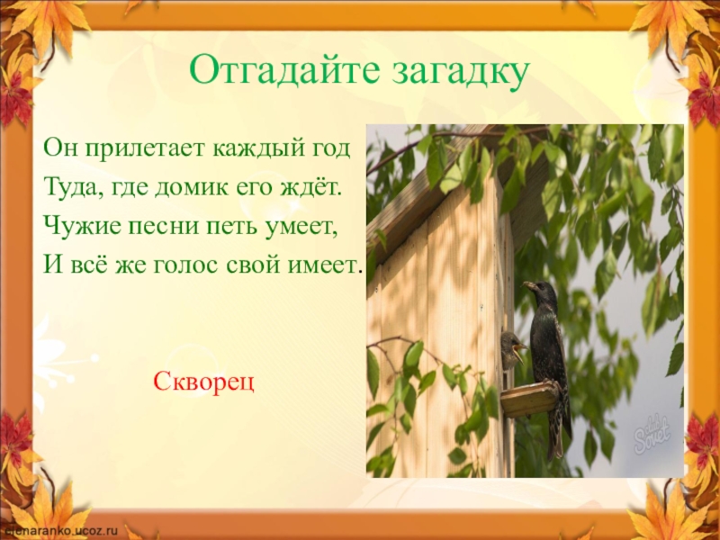 Отгадайте загадкуОн прилетает каждый годТуда, где домик его ждёт.Чужие песни петь умеет, И всё же голос свой имеет.Скворец