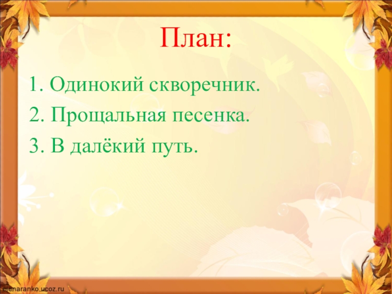 План: 1. Одинокий скворечник. 2. Прощальная песенка. 3. В далёкий путь.