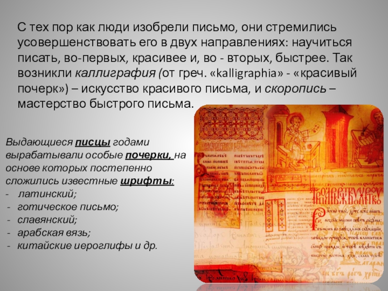 Выдающиеся писцы годами вырабатывали особые почерки, на основе которых постепенно сложились известные шрифты: