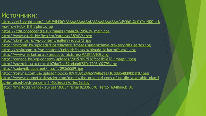 Источники: https://yt3.ggpht.com/-_lMtP4l4S6Y/AAAAAAAAAAI/AAAAAAAAAAA/aFQhGsXq0Y0/s900-c-k-no-mo-rj-c0xffffff/photo.jpg https://cdn.photocentra.ru/images/main20/205629_main.jpg http://www.ru.all.biz/img/ru/catalog/389439.jpeg http://skyships.ru/wp-content/gallery/soyuz/2.jpg http://avtomir.by/uploads/libs/tinymce/images/gusenichnye-traktory-9RX-series.jpg https://sovkusom.ru/wp-content/uploads/blog/b/blyuda-iz-kartofelya/1.jpg http://www.market.ur.ru/products_pictures/MAINTANOS.jpg http://canada.by/wp-content/uploads/2015/09/536fccefb9e78_image1.jpeg http://sovetclub.ru/tim/b1b7daf2cc59bdabdf870c7203b02795.jpg http://sadovnik.ucoz.net/_pu/1/09365589.jpg http://roslyna.com.ua/upload/iblock/f09/f09c24f651948e1a710d88b48d9bbaf8.jpeg http://www.mehmetcetinsozler.com/media/the-pros-and-cons-of-no-dig-vegetable-planting-in-raised-beds-gardens_l_40c2eca27cffed6a.jpg http://img-fotki.yandex.ru/get/3003/irisha182006.8/0_1efc5_6048aa6b_XL