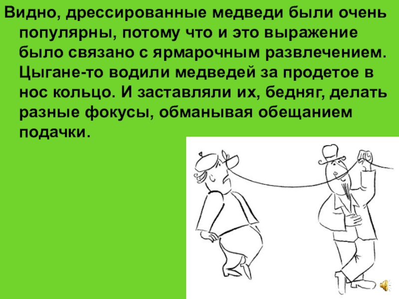 было связано с ярмарочным развлечением. Цыгане-то водили медведей за продетое в нос кольцо. И заставляли их, бедняг, делать разные фокусы, обманывая обещанием подачки.