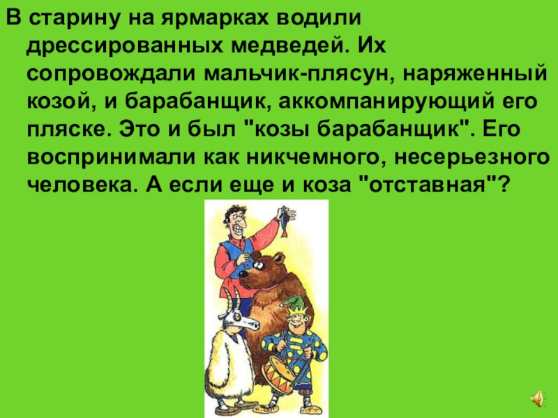 В старину на ярмарках водили дрессированных медведей. Их сопровождали мальчик-плясун, наряженный