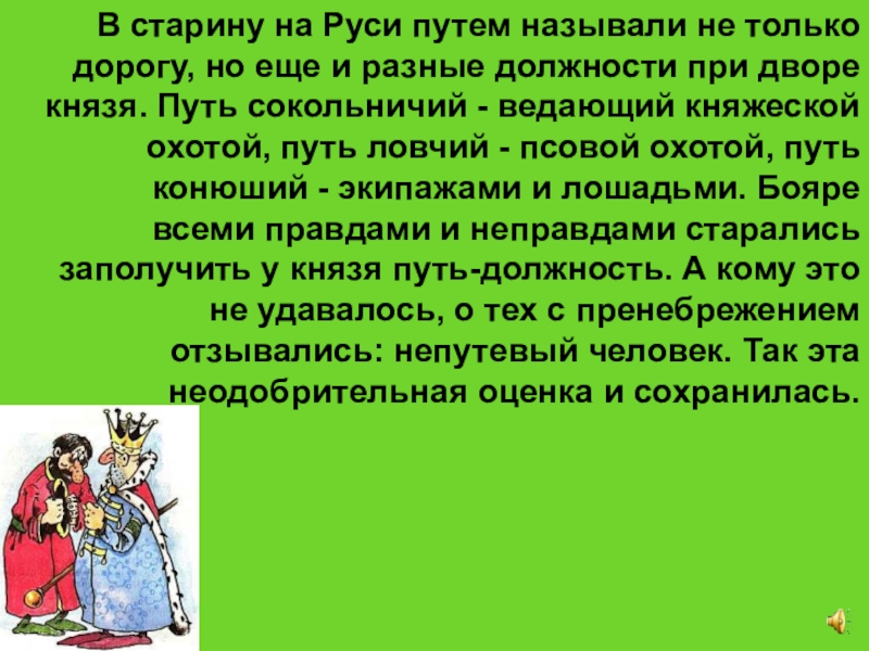 и разные должности при дворе князя. Путь сокольничий - ведающий княжеской охотой, путь ловчий - псовой охотой, путь конюший - экипажами и лошадьми. Бояре всеми правдами и неправдами старались заполучить у князя путь-должность. А кому это не удавалось, о тех с пренебрежением отзывались: непутевый человек. Так эта неодобрительная оценка и сохранилась.