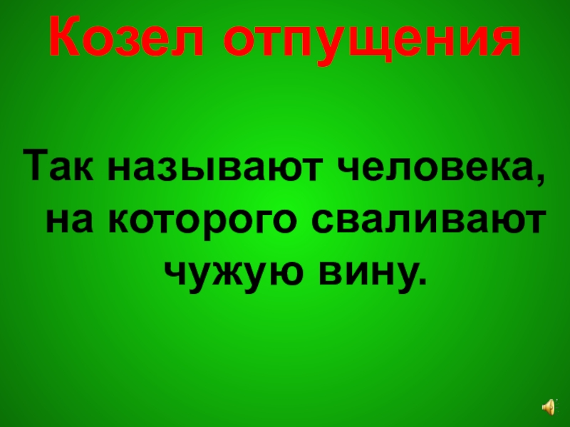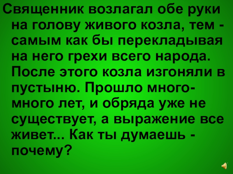 как бы перекладывая на него грехи всего народа. После этого козла изгоняли в пустыню. Прошло много-много лет, и обряда уже не существует, а выражение все живет... Как ты думаешь - почему?