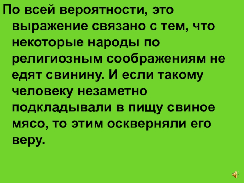 по религиозным соображениям не едят свинину. И если такому человеку незаметно подкладывали в пищу свиное мясо, то этим оскверняли его веру.