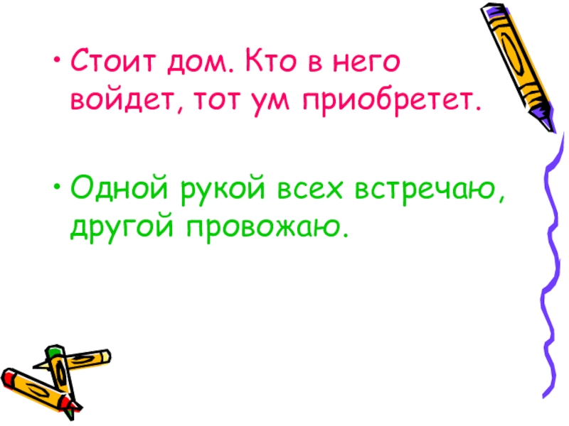 Слайд 11Стоит дом. Кто в него войдет, тот ум приобретет.