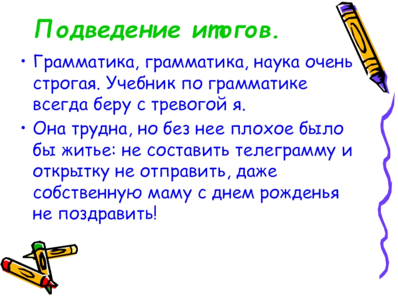 Люблю тебя, грамматика. Ты умная и строгая. Тебя, моя грамматика, Осилю понемногу я.