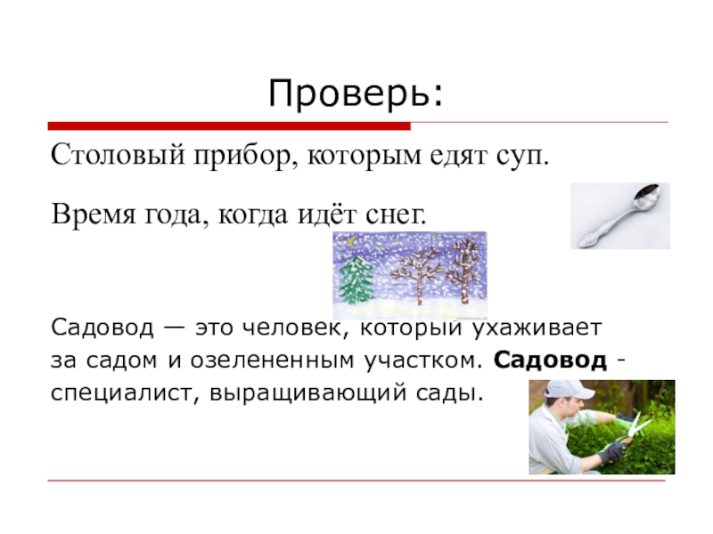 Проверь:Столовый прибор, которым едят суп. Время года, когда идёт снег.Садовод — это человек, который ухаживает за садом и