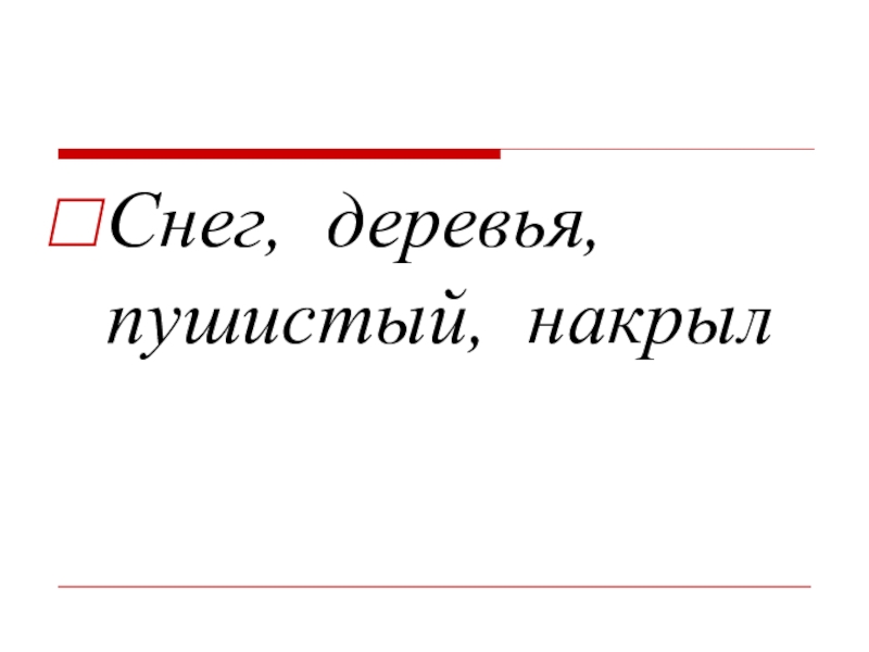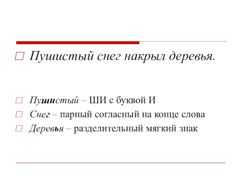 Пушистый снег накрыл деревья.Пушистый – ШИ с буквой ИСнег – парный согласный на конце словаДеревья – разделительный