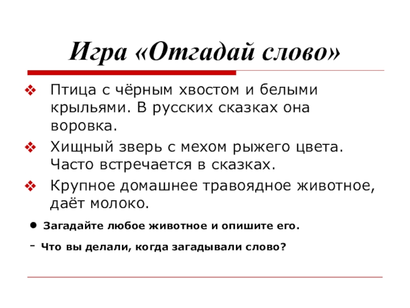 Игра «Отгадай слово»Птица с чёрным хвостом и белыми крыльями. В русских сказках она воровка.Хищный зверь с