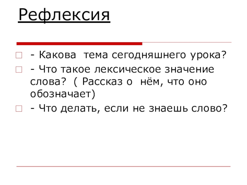 Рефлексия - Какова тема сегодняшнего урока?- Что такое лексическое значение слова? ( Рассказ о нём, что оно