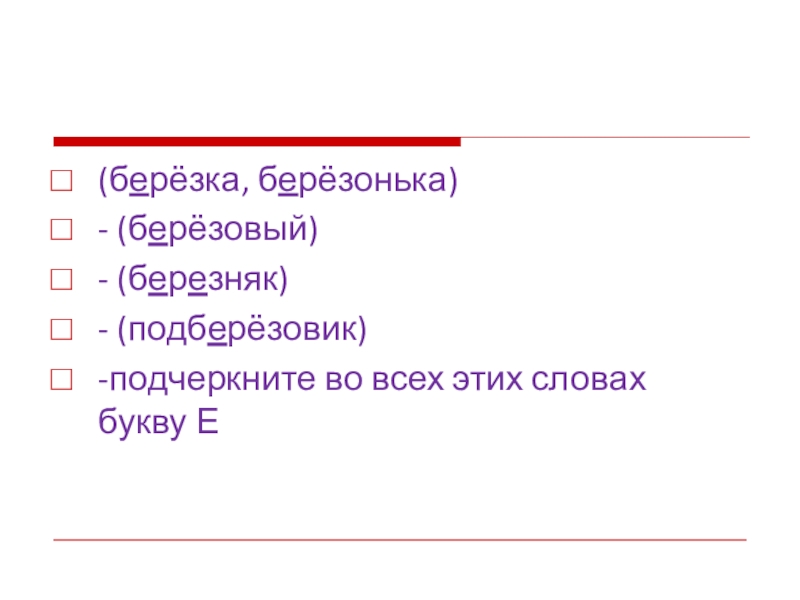 (берёзка, берёзонька)- (берёзовый)- (березняк)- (подберёзовик)-подчеркните во всех этих словах букву Е
