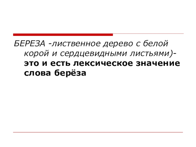 БЕРЕЗА -лиственное дерево с белой корой и сердцевидными листьями)- это и есть лексическое значение слова берёза