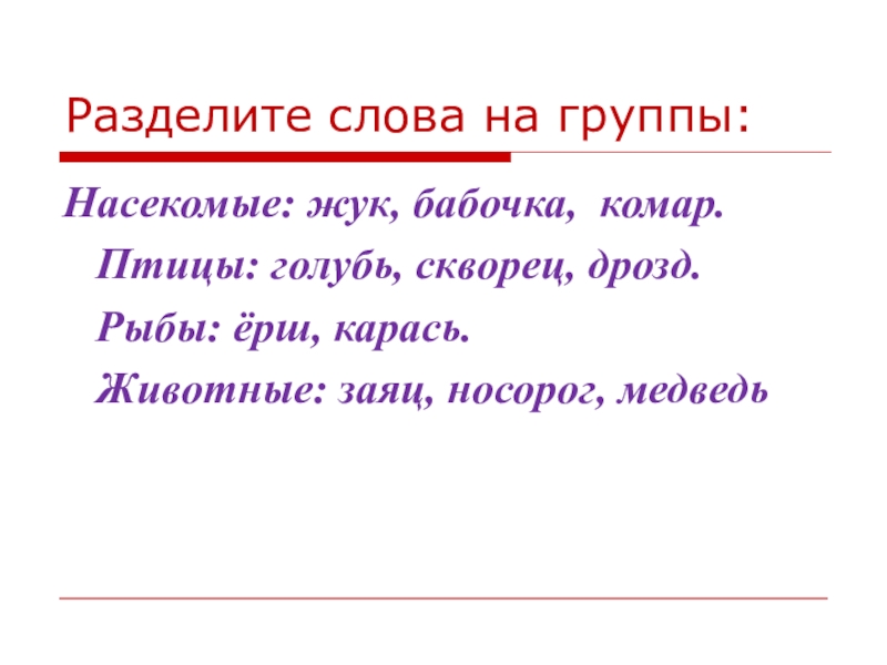 Разделите слова на группы:Насекомые: жук, бабочка, комар.  Птицы: голубь, скворец, дрозд.  Рыбы: ёрш, карась.