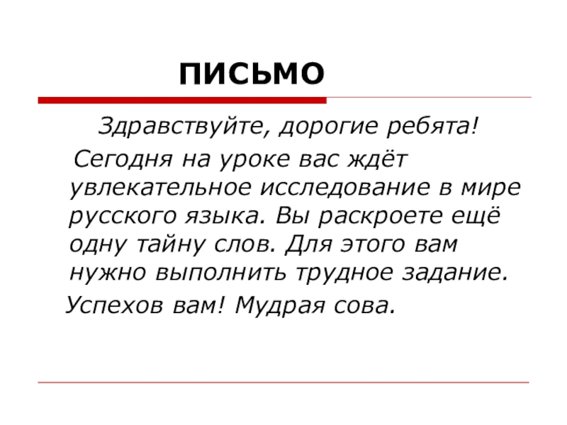 Сегодня на уроке вас ждёт увлекательное исследование в мире русского языка. Вы раскроете ещё одну тайну слов. Для этого вам нужно выполнить трудное задание.