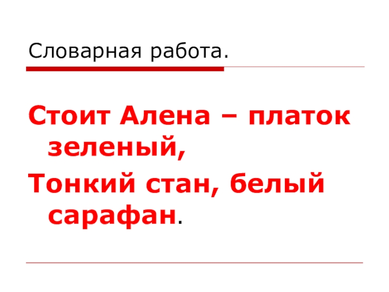 Словарная работа.Стоит Алена – платок зеленый,Тонкий стан, белый сарафан.