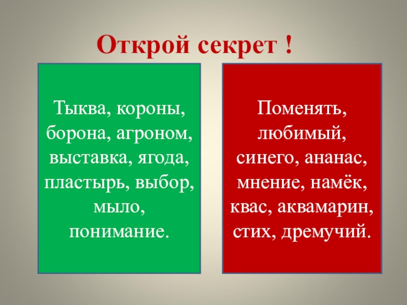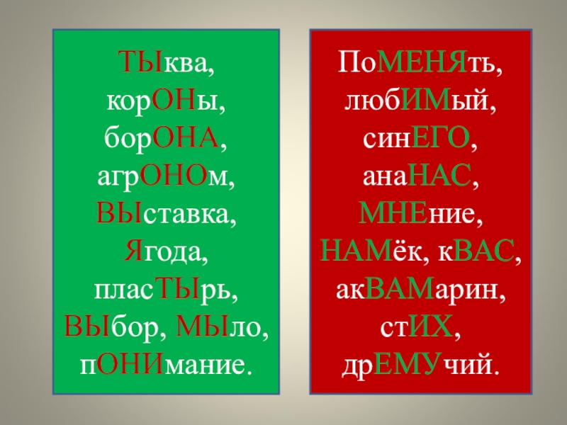 Поменять, любимый, синего, ананас, мнение, намёк, квас, аквамарин, стих, дремучий.