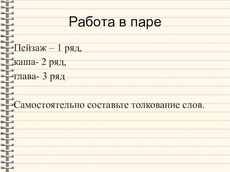 Работа в пареПейзаж – 1 ряд, каша- 2 ряд, глава- 3 рядСамостоятельно составьте толкование слов.